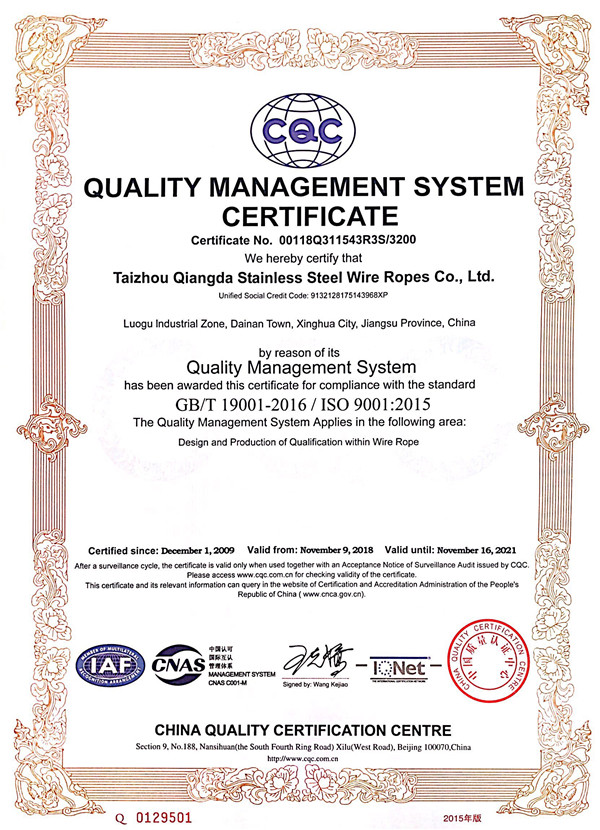 泰州市強達不銹鋼絲繩有限公司位于江蘇興化市戴南經(jīng)濟開發(fā)區(qū),公司致力于不銹鋼絲繩產(chǎn)品生產(chǎn),立志成為“國內(nèi)技術(shù)標桿型吊索具生產(chǎn)企業(yè)”。以此戰(zhàn)略思想指導(dǎo),公司堅決貫徹“質(zhì)量贏市場,管理增效益,誠信贏天下”的質(zhì)量方針。以完善的服務(wù)在國內(nèi)不銹鋼絲繩市場樹立良好的品牌形象。公司榮獲“江蘇省質(zhì)量信得過企業(yè)。 靈活的管理機制,經(jīng)驗豐富的